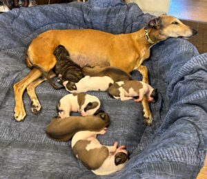 We rarely have puppies and they are often quickly reserved. Two exciting litters are planned for 2026 with one litter expected in April! We evaluate our Windrock greyhounds by extensive profiling and testing starting at 6 weeks of age. We have a pretty good idea of what the personalities are like and can help people select the best candidates according to needs and expectation.