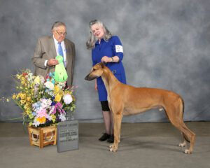 “Firefly” at the tender age of 16 months not only won Best In Sweeps under judge Tracy Hite at the Greyhound Club of America Central Specialty (pictured) but, as a new special, went on to win Specialty Best In Show under judge Wm Shelton.